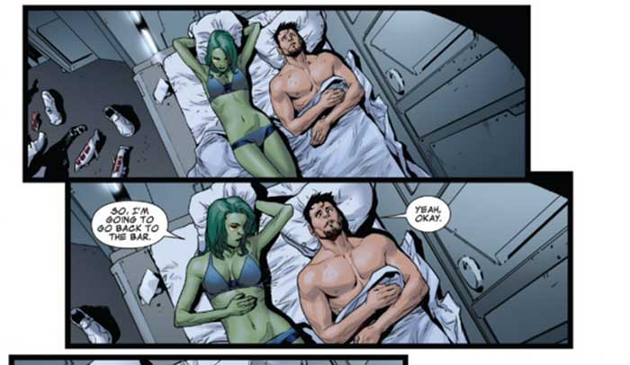 Gamora: La integrante de los Guardianes de la Galaxia que en el cine ha interpretado Zoe Saldana en los cómics ya ha visitado la Tierra. En 2013 Guardians of the Galaxy # 4 de Brian Michael Bendis y Cory Petit, vimos a Stark y Gamora en la cama juntos.