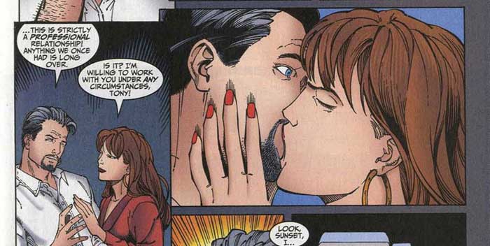 Sunset Bain: Más conocida como Madame Menace, sedució a Tony en Iron Man #19 de Kurt Busiek y Sean Chen. Ella quería saber sus claves y robarle su tecnología.