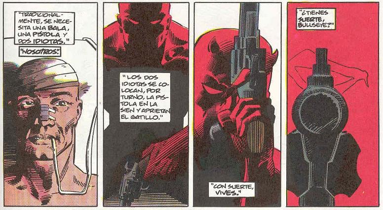 Unas de las historietas más destacadas de esa etapa es ‘Ruleta’. En este imprescindible cómic, Daredevil juega con su gran enemigo Bullseye, que se encuentra paralítico, a la ruleta, pero no a cartas ni a nada parecido, sino a una ruleta con una pistola y una bala. Primero apunta la cabeza de su enemigo y después la suya. Su odio arranca por el asesinato de Elektra por parte de Bullseye y de la historia que le cuenta mientras está tumbado en la cama. Miller bucea, a partir del drama vivido por un niño seguidor de Daredevil, en la personalidad del personaje, busca y reproduce su parte más interior, más honda y plantea en voz alta algunas de las cuestiones más intrínsecas que coexisten en su ser: «¿Combato la violencia… o la propago?«.
