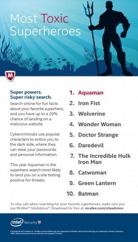 El alter-ego superheroico de Arthur Curry ha salido elegido como el superhéroe más tóxico de Internet, según el estudio que ha elaborado Intel Security mediante el soporte McAfee SiteAdvisor. Cada año, esta empresa realiza una lista con los nombres de los superhéroes -tanto de Marvel como DC Comics– que más peligro supone al sujeto cibernético a la hora de infectar su ordenador cuando buscan información sobre ellos en la red. Por otro lado, además de McAfee SiteAdvisor, las páginas de Google, Bing y Yahoo también han aportado su granito de arena para confeccionar la lista, ya que aportan el nivel de riesgo de esta búsqueda específica en determinados dominios de la red.