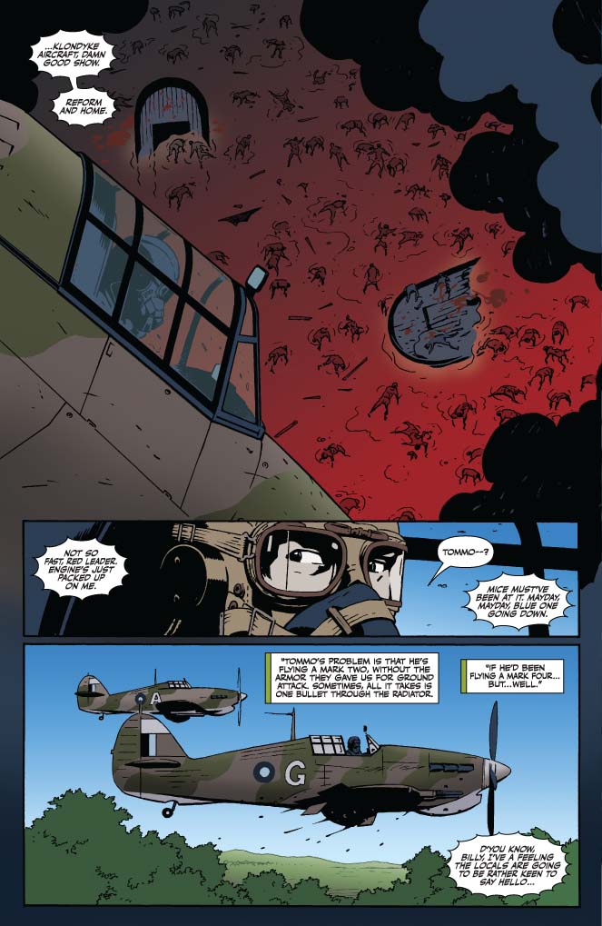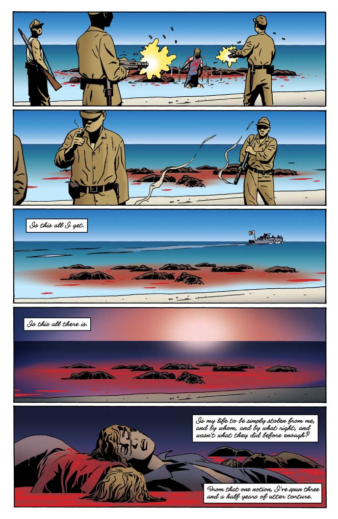 Garth Ennis nos pone en el lugar de una mujer ultrajada, pero dura como la piedra. Nos cuenta a través de los recuerdos y las explicaciones de una carta a su gran amor lo cruel de la guerra, nada que ver con heroicas batallas y grandes victorias, sin sacrificios para recordar o grandes acciones que cambian la dirección de la guerra. Sólo dolor, amor, y un rencor que retuerce las tripas. Ennis es un habil narrador, conocido por su vis cómica y su capacidad de destruir las bases de cualquier genero, de regenerarlo o de alterar la visión del mismo, aquí se deja de artificios y cuenta la historia de una mujer desde que murió y volvió a la vida dos veces, cuando la salvaron, y cuando conoció a Billy. Directo a las vísceras, sin concesiones, así son las historias del norirlandés cuando quiere contar la realidad asquerosa y dolorosa que hay en la guerra.bfbilly01:layout 1