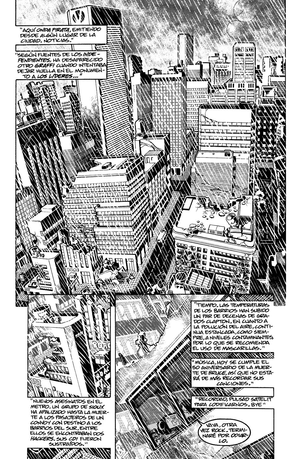 La historia está planteada en tres números lo que significa que el trasfondo es ligero, un futuro distópico muy tecnológico y lleno de métodos de control. Es directa, lineal, al grano, una historia de acción con una meta clara, una crítica a la sociedad de control y a la indiferencia que permite que actúe. Esto se revela a través de un dibujo oscuro y opresivo, de composiciones y ángulos imposibles, abarrotado en todo momento y dejando pocos espacios libres, recargada hasta la extenuación para asfixiar al lector. La representación de un futuro en el que la libertad solo llega a pequeñas rachas, y hay que pelearlas.