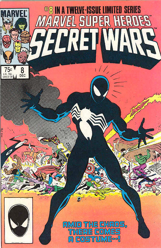 Secret Wars número 8. Sin duda un cómic imprescindible para saber de donde viene el simbionte al que luego conoceríamos como Venom y ver por primera vez a Spider-Man con su traje negro. El título apareció en el año 1984 con guión de Jim Shooter, la mini-serie contaba como eran enviados un grupo de super-héroes y Super villanos a un planeta creado por El Todopoderoso, en el cual se decidiría el destino del universo dando inicio a uno de los crossovers más grandes hasta la historia de Marvel.