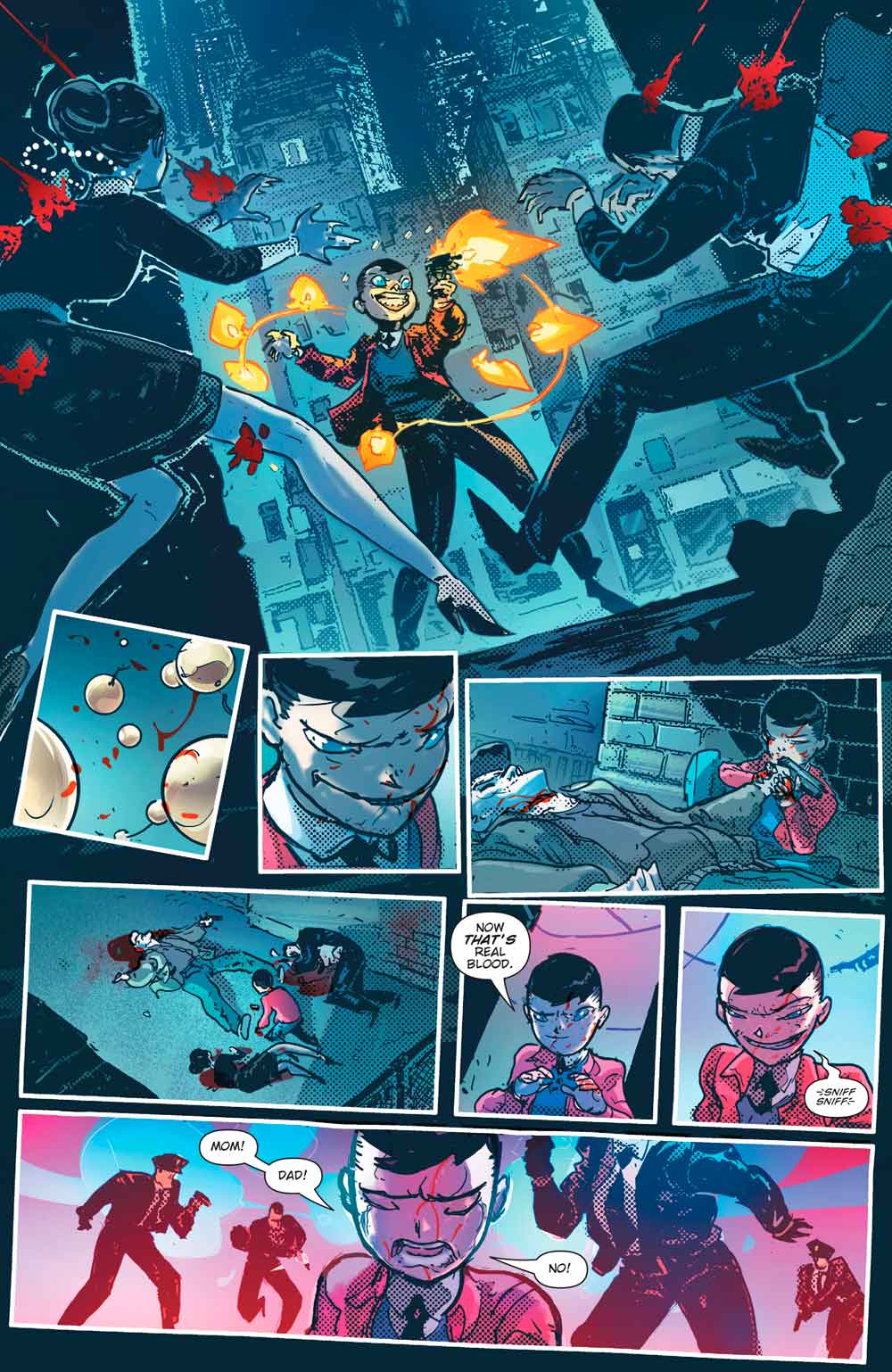 Todo esto culminó en una escena que los fans de Batman reconocerán: Bruce y sus padres abandonan el cine, solo para verse obligados a entrar en el «Callejón del crimen». Cuando aparece un asaltante y amenaza con atacar a la familia, el joven Bruce interviene rápidamente, apuñalando al asaltante en la yugular y dejándolo desangrarse hasta morir. Cuando Martha y Thomas Wayne se dan cuenta de lo que ha hecho su hijo, comienzan a tratar de razonar con él, solo para que él también se vuelva contra ellos. Bruce les dispara a los dos en un brutal acto de violencia, y luego procede a llorar haciéndose pasar por la víctima en el momento en que llegan las autoridades.