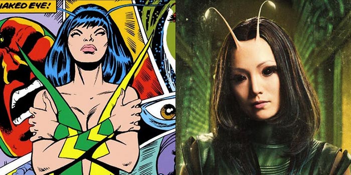 Imagen comparativa entre la Mantis de los cómics y la de las películas