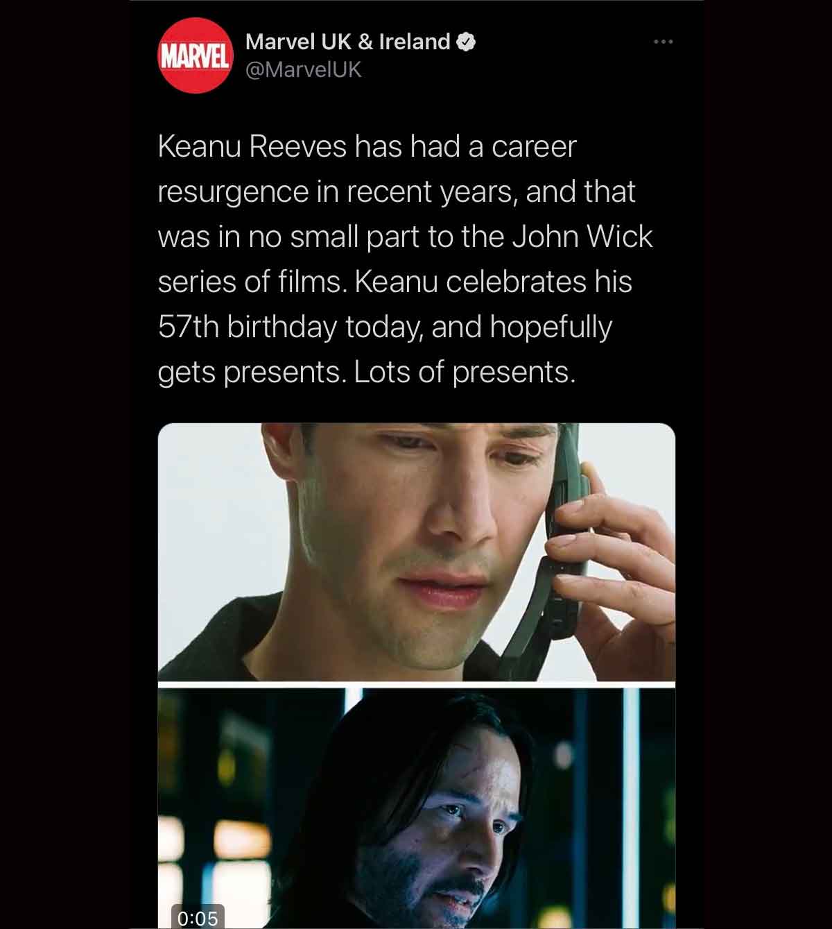 Puede que solo haya sido un gesto de cariño hacia uno de los mejores actores de la actualidad como es Keanu Reeves, pero la cuenta de twitter del Reino Unido de Marvel ha vuelto locos a los fans del Universo Cinematográfico al felicitar el cumpleaños del actor.