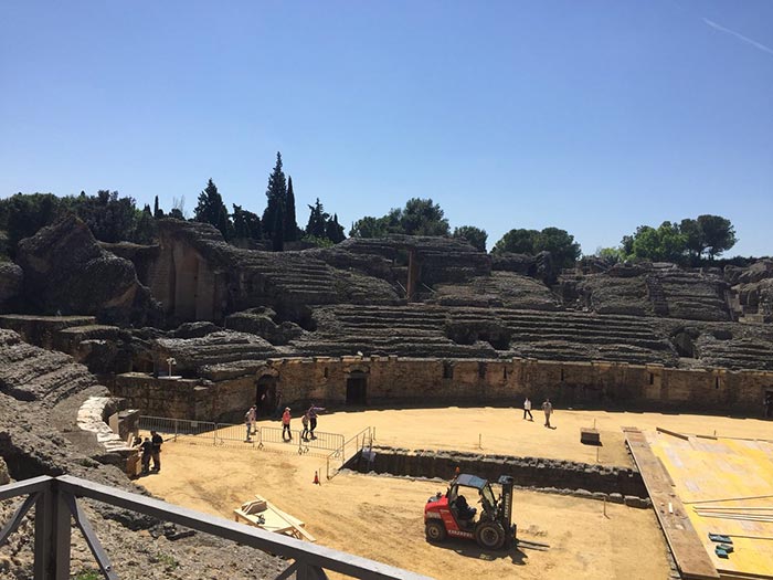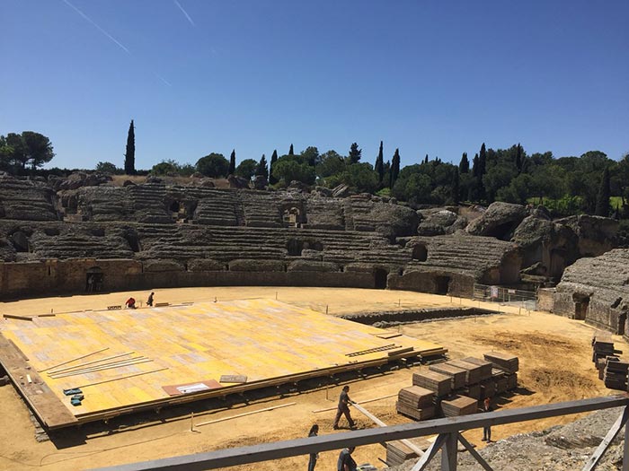 En el anfiteatro de Itálica en Santiponce, Sevilla. Últimando los detalles para transformarlo en Pozo Dragón. El próximo lunes regresa #JuegoDeTronos #GameofThrones para grabar la octaba temporada pic.twitter.com/03a7o8O3tp