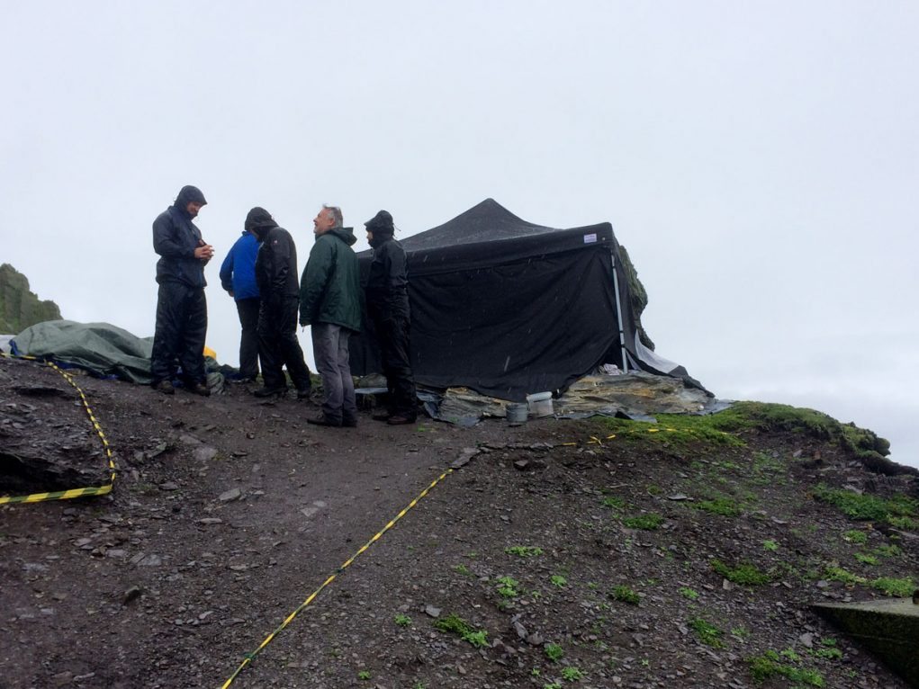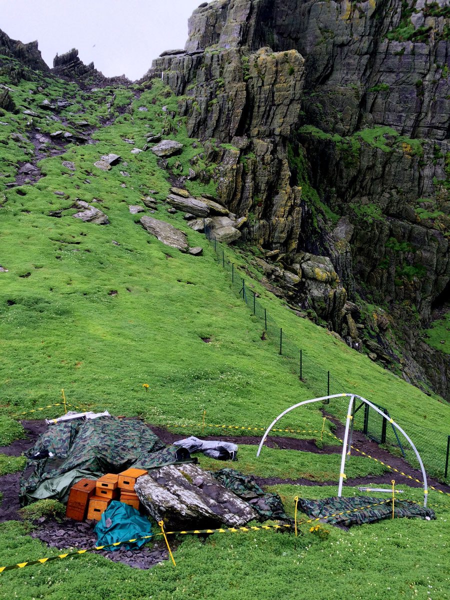 Tiendas y carpas repletas de equipo técnico y herramientas ocupaban toda la isla sin ningún tipo de vigilancia, excepto una tienda que estaba en la cima de una falsa roca de color arena construida para la película… Creo que Luke Skywalker estará de pie sobre esa roca mañana. Hablando con personas que no puedo nombrar, ya que tienen miedo de meterse en problemas, he descubierto que hay droides guardados en la isla. Seguramente BB-8, R2-D2 o incluso ambos, pero nadie pudo confirmármelo porque no había visto las películas de Star Wars. Además, junto a los droides había armas… Presumiblemente un sable de luz, o dos. También hemos descubierto que el set se ha descrito como «Monasterio Jedi» y que habrá escenas con máquinas de viento y lluvia.