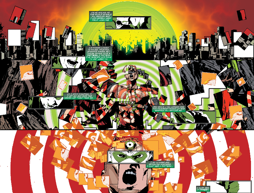 Si la historia es importante, el arte es también impresionante. El artista italiano Andrea Sorrentino firma un trabajo mayúsculo. Imaginación al poder para este hombre que en febrero firmó en exclusiva para Marvel, la pasta es la pasta, y que tras X men parece que volverá a dibujar arcos y flechas en ‘Ojo de Halcón’. En ‘Green Arrow’ ha desarrollado lo que para mí son sus mejores paginas. En ‘Yo, vampiro’ ya vimos de lo que era capaz, y con Oliver Queen aumenta la dificultad. Usa las sombras como lienzos y ambientes para increíbles puestas en escena de acciones múltiples, con composiciones de pagina increíbles, destacando la plasticidad de la acción en planos generales que cubren mosaicos de detalles y movimientos.