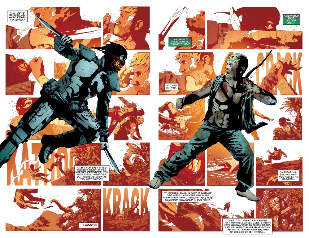 Los anteriores escritores de la serie J.T. Krul y Ann Nocennti no profundizaron en el pasado de Oliver Queen, su vida en la isla y su disposición a ser un héroe era todo el pasado que necesitaron para hablar de un niño rico metido a justiciero debido a un gran trauma. Era el enfoque clásico y funcionaba. Sus etapas resultan más de lo mismo dentro de la vida de Green Arrow, dignas y llenas de entretenimiento, pero no consiguieron darle fuerza a un personaje que tuvo a autores de la talla de Dennis O’Neil y Neal Adams, Mike Grell, Kevin Smith con Phil Hester o Judd Winnick y Scott McDaniel. Estos autores tuvieron feeling y tiempo para desarrollar grandes etapas, Krul y Nocennti tuvieron poco tiempo y demasiados cambios. Krul venía de ser el responsable de la última serie de Queen en el anterior universo, y los cambios que incluyó para el nuevo resultaron interesantes, Nocennti siempre tuvo a Arrow como parte dela historia más que como centro de ella, eso perjudicaba una colección que siempre se basó en algo simple, Green Arrow era un hombre con un arco y un puñado de flechas, algunas espectaculares y otras hasta ridículas (¿flecha guante de boxeo?).