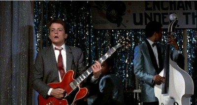 - La histórica actuación musical de Marty McFly en el baile de fin de grado, además de pasar a la historia de la saga, tiene uno de los momentos más curiosos de la primera película. McFly toca la canción de Chuck Berry, «Johny B. Goode«, a pesar de que en 1955 todavía no existía esa obra. El guitarrista que se había lesionado durante la noche y había dejado su hueco a Marty llama entonces por teléfono y grita: «¡Primo Chuck! ¿Recuerdas el sonido que andabas buscando? Escucha esto«.