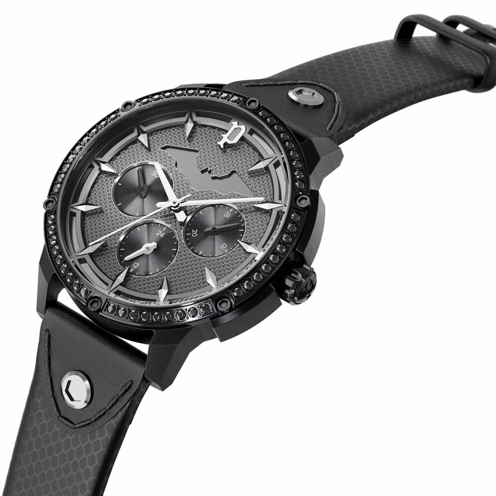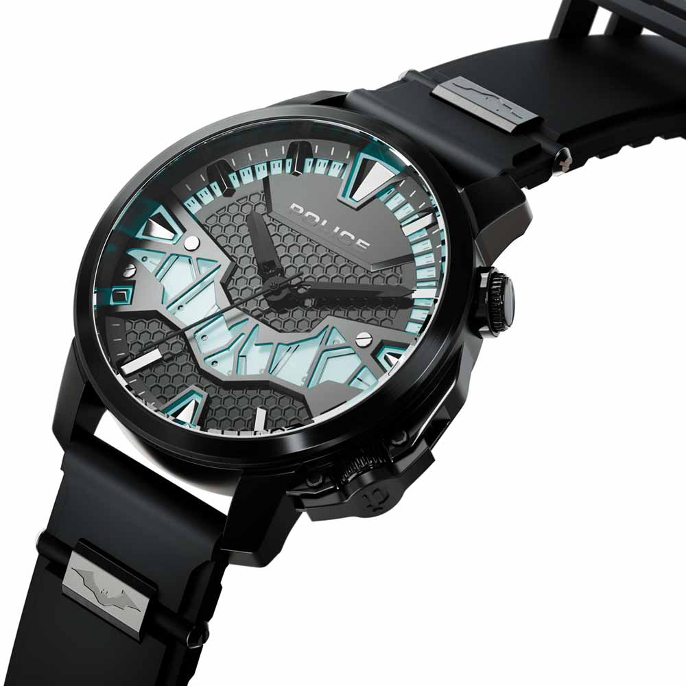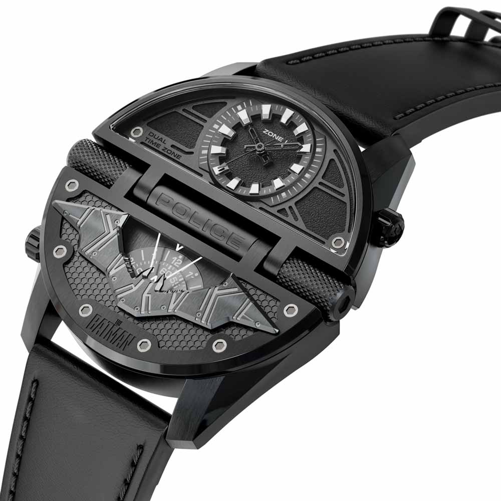 La furia desatada de THE BATMAN cobra forma en el modelo Vengeance Edition. Este reloj cuenta con tres esferas para tres zonas horarias distintas. La caja y la correa son de acero inoxidable chapado en negro. La esfera principal está alojada en el interior, con índices que se elevan hacia arriba y hacia fuera. La caja y la esfera tienen una gran personalidad gracias a la incorporación de tornillos industriales y el símbolo de Batman estratificado, lo que crea una sensación de profundidad e innovación. Cada corona acanalada lleva el famoso logotipo «P» de Police.