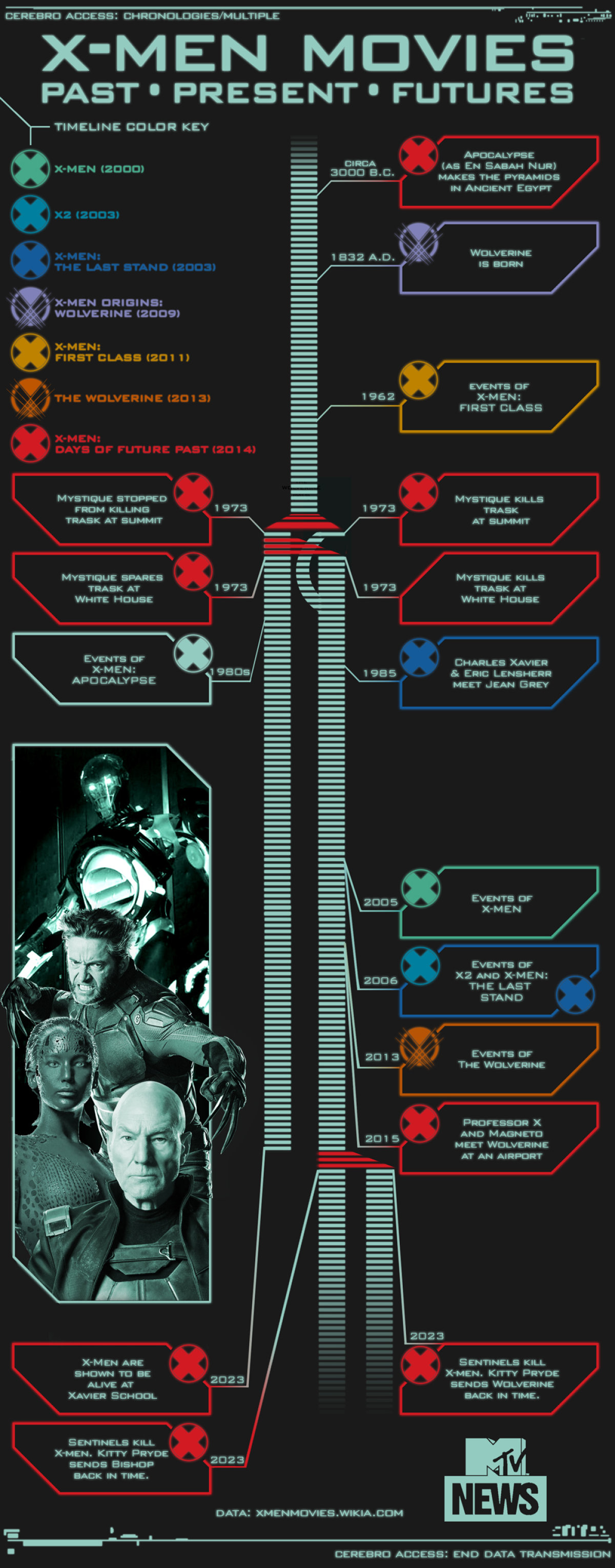 Por otro lado como muchos sabéis algo que siempre ha fallado en la franquicia de X-Men en el cine ha sido su falta de continuidad entre ellas y X-Men: Días del Futuro Pasado trata de remediar todos ellas, por lo que es fácil estar todavía un poco confundido sobre todo si no has visto las anteriores entregas recientemente. Por lo que MTV News ha creado la siguiente infografía que establece la línea de tiempo y representa eventos de todas las 7 películas. (Atención a partir de ahora contiene Spoliers).