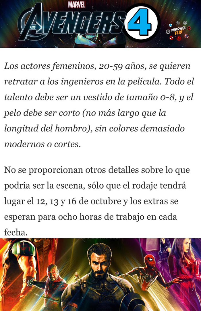 ¡¡El último SPOILER de ‘Vengadores 4‘ sería el mayor bombazo de la historia de Marvel Studios!! Avisamos: ESTO NO ESTÁ CONFIRMADO. Nos hemos dejado llevar muchísimo por la emoción con esta noticia que ha saltado en redes sociales. Supuestamente, el casting del estudio presidido por Kevin Feige está buscando a «actrices de entre 20-59 años, con el pelo corto y sin colores modernos«. Dejamos la información completa:
