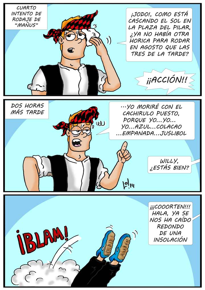 La tira cómica de Willy llevaba una temporada más ocioso (es decir, vago) que de costumbre, pero ha decidido impulsar su devaluada carrera e impulsar por fin la ambiciosa ‘Mañus’, historia épica sobre un aguerrido zaragozano en la que ostenta el papel principal. Tras tres intentos frustrados de avanzar el rodaje, Willy pensaba que ahora todo funcionaría, pero el calor ha hecho acto de presencia. ¿A quién se le ocurriría planificar una escena en el momento del día de mayor temperatura y solazo en Zaragoza?