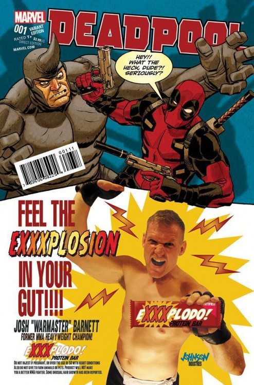 Aprovechando esta lamentable estrategia de marketing, Marvel Comics ha usado a Deadpool para parodiar este hecho y volverlo todavía más esperpéntico, si es que es posible. En una portada alternativa del cómic de «Deadpool«, podemos ver a un sujeto anunciando una marca de barras de proteínas falsa denominada «XXXplodo!» y levantando -literamente- la portada de Deadpool, cuyo bocadillo claramente le dice: «¡Ey! ¿Qué demonios, colega? ¿En serio?«. Os la dejamos aquí para que la veáis: