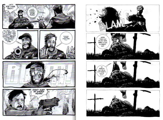 1 – La muerte y posterior muerte otra vez de Shane. En la serie como son así de meapilas le dan un final rápido y medianamente limpio y aséptico a Shane (no sin antes dejarlo como un “joputa”). El Sheriff chiflado le clava un puñal en las tripas y luego el hijo gilipollas lo remata con el arma que lleva encima, que a veces usaba como mando a distancia allá por Alabama. En la historieta original es el hijo quien lo mata al ver que va a perder al cabeza de su familia cristiana sureña. Meses después el Sheriff paleto regresa a la tumba y tras desenterrarlo lo remata una vez zombificado. Cruel y duro, como a mi me gusta.